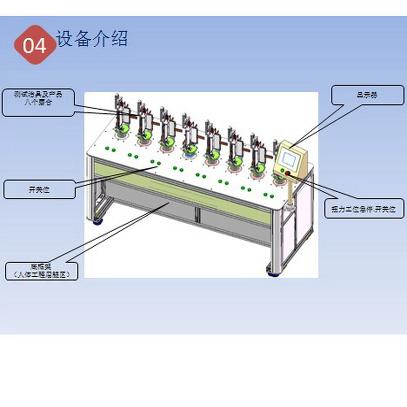 转轴铰链在设备上使用频繁,且生产工艺较为难以控制。铆合强度过大或者过小都会影响产品的品质。所以一般厂家在生产时,对产品进行100%的磨合测试。同时也加大产品的寿命测试数量。当然研发时对产品的扭力衰减进行测试也是不可少的一个测试项目。加大抽检数量,为增加测试效率,所以就需要多工位的磨合试验机。当然也需要考虑实验室的空间。市场上一般有三工位,五工位,八工位等磨合跑合试验机。针对市场要求,推出一款八工位转轴磨合试验机